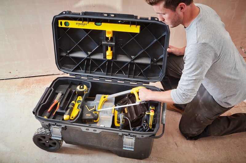 113 l užitného prostoru. Pružinové držáky pro upevnění vodováhy a pily ocasky. Výsuvné přihrádky na nářadí. Vodě odolné díky pryžovému těsnění pod víkem boxu. Velká kolečka pro dobrou průchodnost v terénu. 1 přenosná vanička s rukojetí pro ukládání a samostatnou manipulaci s drobnějším nářadím. Zámek integrovaný do konstrukce víka pro zlepšení zabezpečení obsahu proti odcizení. Lze použít i jako pracovní stolek - ve víku jsou integrované žlábky pro založení latí apod. řezání. Zasouvací tažná rukojeť. Rozměry 91 x 51,6 x 43,1cm
