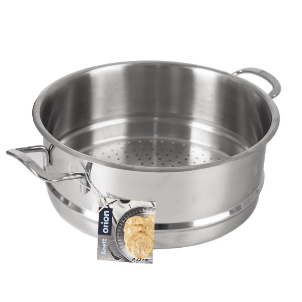 Nerezový cedník Anett vnějšího průměru 24 cm, s perforovaným dnem a dvěma držadly, je šikovnou vložkou do hrnce, díky které se z obyčejného hrnce stane napařovací. Je vyroben z nerezové oceli třídy 304. Nadýchané houskové knedlíky snadno díky cedníku ohřejete, hodí se i pro přípravu kynutých sladkých knedlíků nebo k vaření zeleniny v páře. Je to navíc jedna z nejšetrnějších a nejzdravějších příprav pokrmů.Vnitřní velikost 22 cm. Hodí se ke kombinaci s kastrolem Anett 6,2 l, hrnce Anett 8,1 l nebo kastrolu Dalie 5,3 l. Po použití ho lze mýt v myčce.