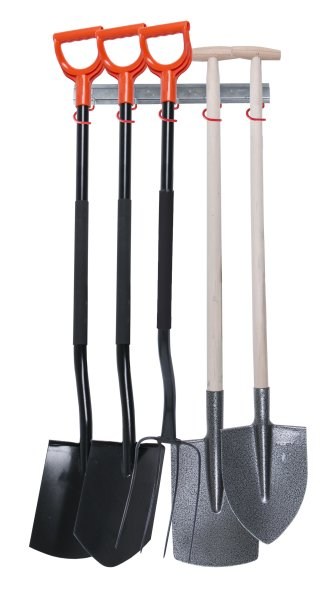 Praktický kovový držák zahradního nářadí na stěnu, 5 ks pohyblivých kovových háčků. Výhodou je velká skladovatelnost a přehlednost pověšeného zahradního nářadí, celková délka držáku : 500 mm.
