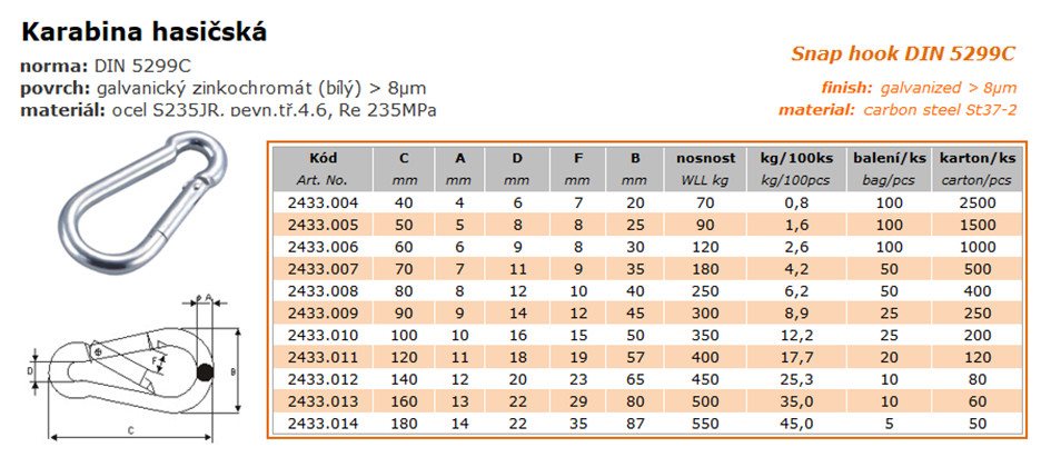 Karabina hasičská 180x14 Zn 2433.014 DIN5299C Karabina hasičská 180x14 Zn 2433.014 DIN5299C Kód: 1090810 P/N: 2433.014 Záruka: 24 Měsíc(ů) Výrobce: Měrná jednotka: ks Dostupnost: Skladem 5 Cena bez DPH: 60,42 Kč Cena s DPH: 73,11 Kč Rozpis cen Recyklační poplatek: 0,00 Kč Autorský polatek: 0,00 Kč Množství ks Do košíku Popis Podrobnosti povrch: galvanický zinkochromát (bílý) > 8µmmateriál: ocel S235JR, pevn.tř.4.6, Re 235MPa