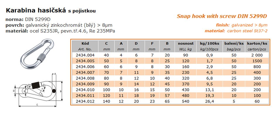 Karabina hasičská s pojistkou 40x4mm 2434.004 DIN5299D Karabina hasičská s pojistkou 40x4mm 2434.004 DIN5299D Kód: 1090820 P/N: 2434.004 Záruka: 24 Měsíc(ů) Výrobce: Měrná jednotka: ks Dostupnost: 10 a více Cena bez DPH: 6,02 Kč Cena s DPH: 7,28 Kč Rozpis cen Recyklační poplatek: 0,00 Kč Autorský polatek: 0,00 Kč Množství ks Do košíku Popis Podrobnosti povrch: galvanický zinkochromát (bílý) > 8µmmateriál: ocel S235JR, pevn.tř.4.6, Re 235MPa