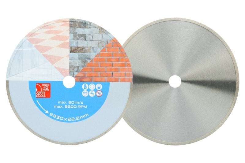 Diamantový kotouč DIAMANT, provedení : "PLNÝ" - celoobvodový, kvalitní diamantová vrstva s vysokým obsahem diamantového prachu, přesné zpracování - napojení na nosný disk kotouče odolávající vysokým teplotám, použití : určený pro mokré i suché řezání dlažby a obkladů, betonu, cihel, zdiva, žuly, mramoru, kamene, skla, keramiky, balení : blistr s eurootvorem, přiložen redukční kroužek z O 22,2 na 20 mm, rozměry : uvedeny v názvu výrobku.