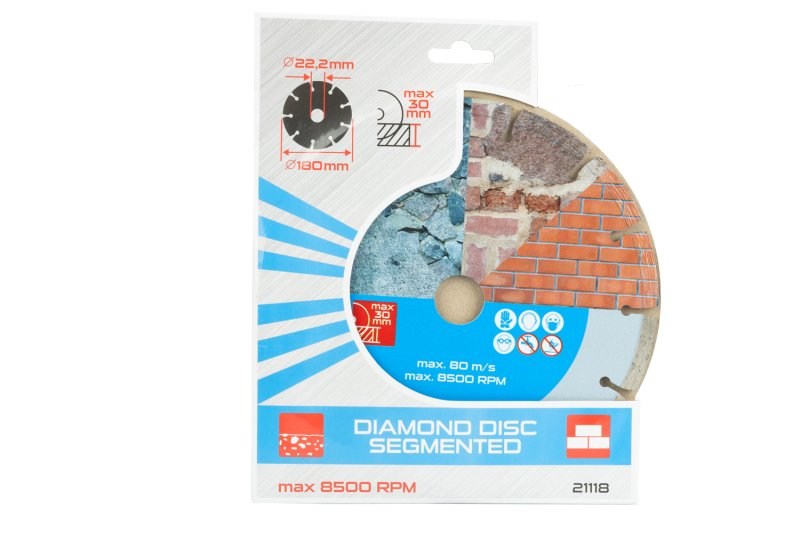 Diamantový kotouč DIAMANT, provedení : SEGMENTOVÝ, kvalitní materiály i zpracování - vysoce pevné uchycení diamantových segmentů k nosnému disku kotouče, vysoký obsah diamantového prachu v segmentech, použití : pro suché řezání betonu, cihel, zdiva, kamene, ... , balení : blistr s eurootvorem, přiložen redukční kroužek z O 22,2 na 20 mm, rozměry : uvedeny v názvu výrobku.