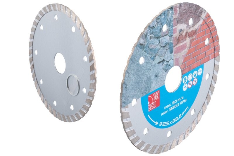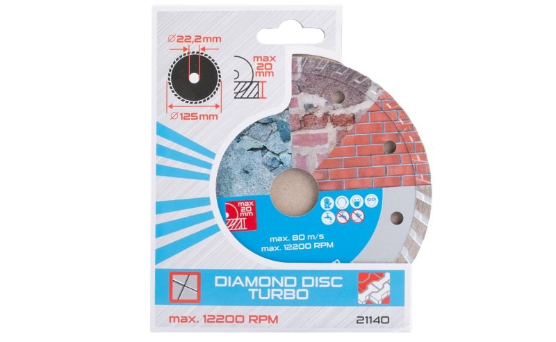 Diamantový kotouč DIAMANT, provedení : TURBO, kvalitní materiály i zpracování, speciální tvar diamantových segmentů i konstrukce a pevné uchycení k nosnému disku kotouče, vysoký obsah diamantového prachu, použití : pro suché i mokré řezání betonu, železobetonu cihel, zdiva, kamene, balení : blistr s eurootvorem, přiložen redukční kroužek z O 22,2 na 20 mm, rozměry : uvedeny v názvu výrobku.