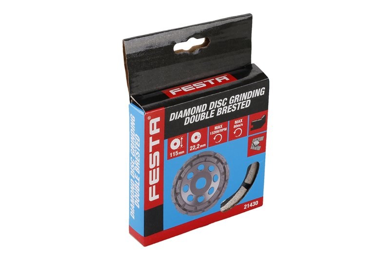 Brusný diamantový kotouč FESTA -dvouřadý, robustní nosný talíř je z pevné slitiny, speciální konstrukce uchycení diamantových segmentů k nosnému disku kotouče, vysoký obsah diamantového prachu v segmentech, použití : pro suché i mokré broušení mramoru, žuly, cihel, zdiva, přírodního i umělého kamene, obkladů, dlažeb, betonu..., tvar a provedení segmentů je vhodné pro hrubé a rchlé obrušování, rozměry : uvedeny v názvu výrobku, balení : papírový box s eurootvorem.