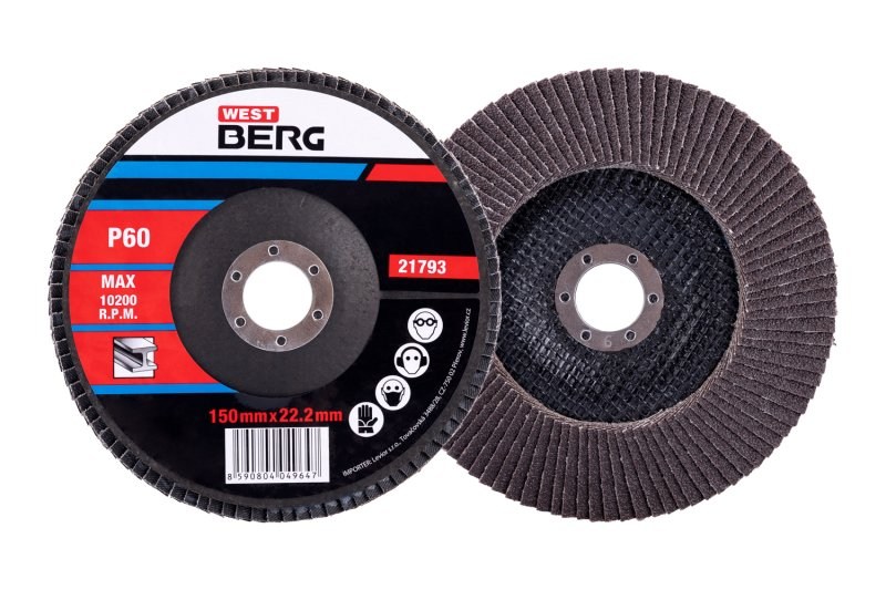 Lamelový kotouč, zrnitost: 60; druh zrna: oxid hlinitý; pojivo: umělá pryskyřice; podkladový materiál: pružná tkanina - 100% bavlna (240-260g/m2); provedení: vyhnutý; otvor : O 22,2mm, max. pracovní rychlost : 80m/s, max. přípustné otáčky: 13300 1/min, použití : broušení, obrušování, odrezování, odstraňování nátěrů, ...., rozměry : uvedeny v názvu výrobku.