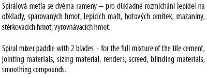 Míchadlo spirála drát ( metla ), pozinkované, rozměr : O 60 x 500 mm - šestihran, použití : pro důkladné rozmíchání lepidel na obklady, spárovaných hmot, lepících malt, hotových omítek, mazaniny, stěrkovacích hmot, vyrovnávacích hmot.