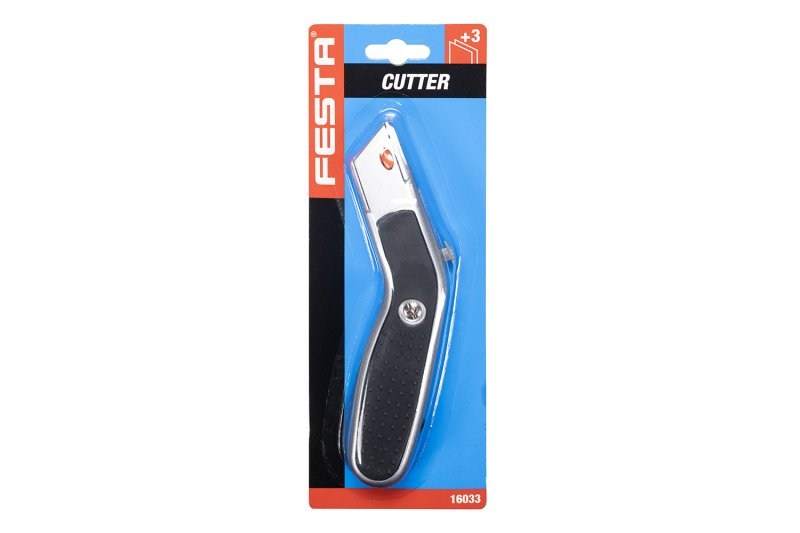 Kovový nůž s výsuvnou lichoběžníkovou čepelí, čepel uchycena uvnitř těla nože na posuvném jezdci, ergonomický tvar s pogumovanou rukojetí, výklopný zásovník na náhradní čepele.