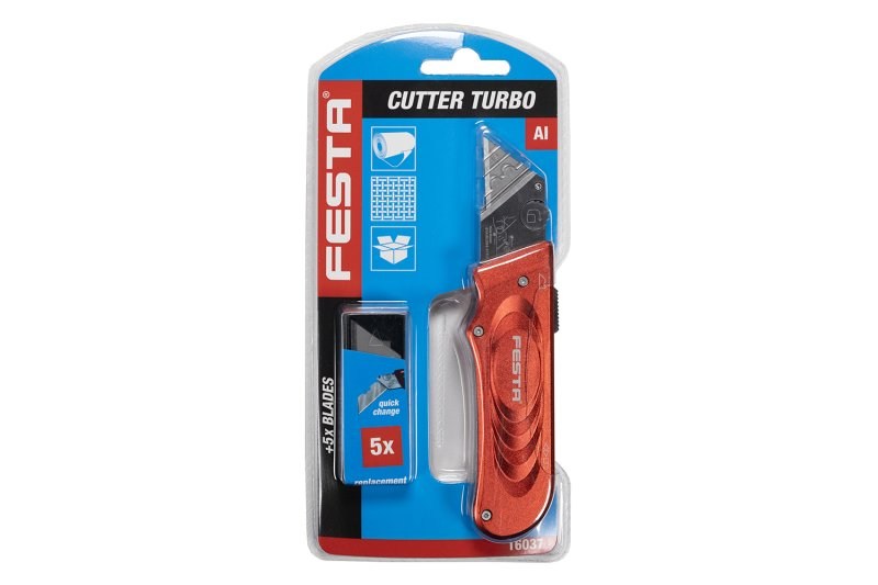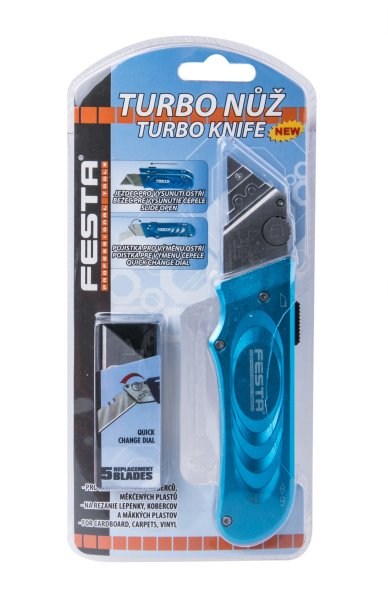 Profesionální celokovový nůž, výsuvná lichoběžníková čepel s aretačním tlačítkem, klip na opasek, 5 náhradních čepelí.