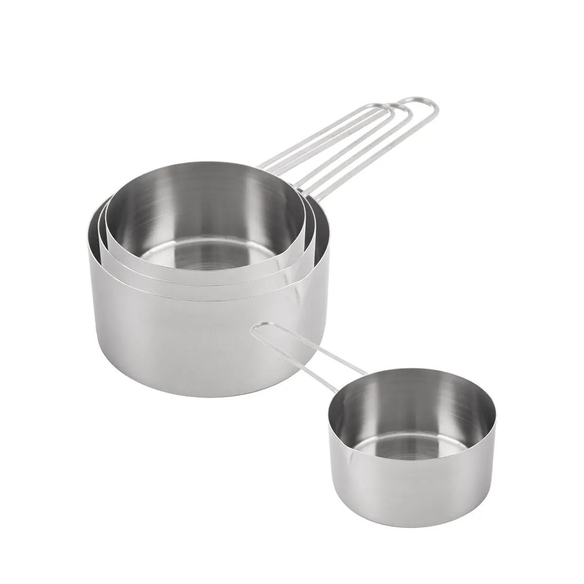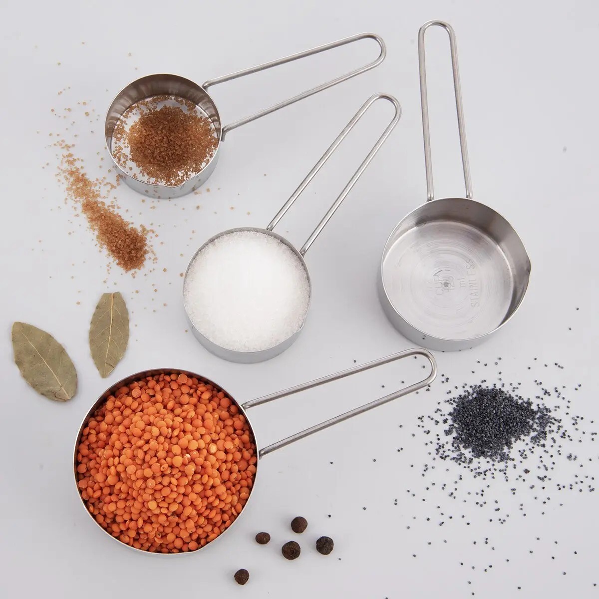 Sada 4 nerezových odměrek s rukojetí je ideálním pomocníkem pro přesné odměřování ingrediencí jako cukr, mouka nebo mleté ořechy. Díky praktickému designu se jednotlivé odměrky dají složit do sebe, což šetří místo při skladování. Jsou vyrobeny z kvalitní nerezové oceli, která je odolná a snadno se čistí. Každá odměrka má ergonomickou rukojeť pro pohodlné držení a snadné používání. Materiál: nerezová ocel. Rozměry: pr. 5,5 cm, v. 2,5 cm, o. 60 ml=1/4 šálku, pr. 6 cm, v. 3 cm, o. 80 ml=1/3 šálku, pr. 6,7 cm, v. 3,3 cm, o. 125 ml=1/2 šálku, pr. 8 cm, v. 4,2 cm, o. 250 ml=1 šálek. Lze mýt v myčce, nelze použít v MVT.
