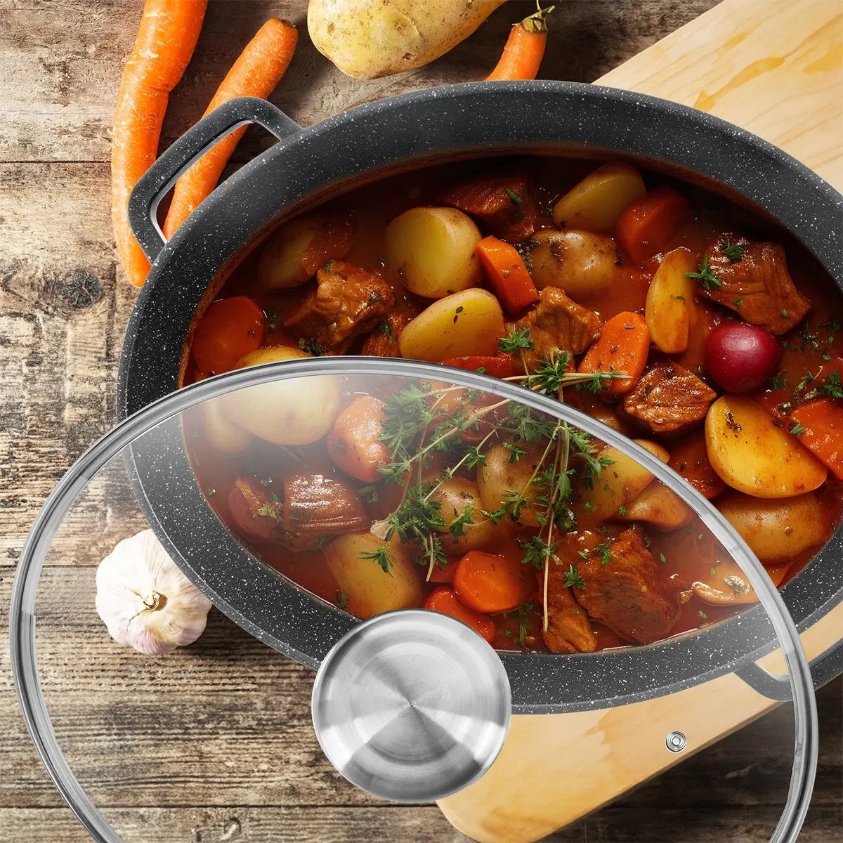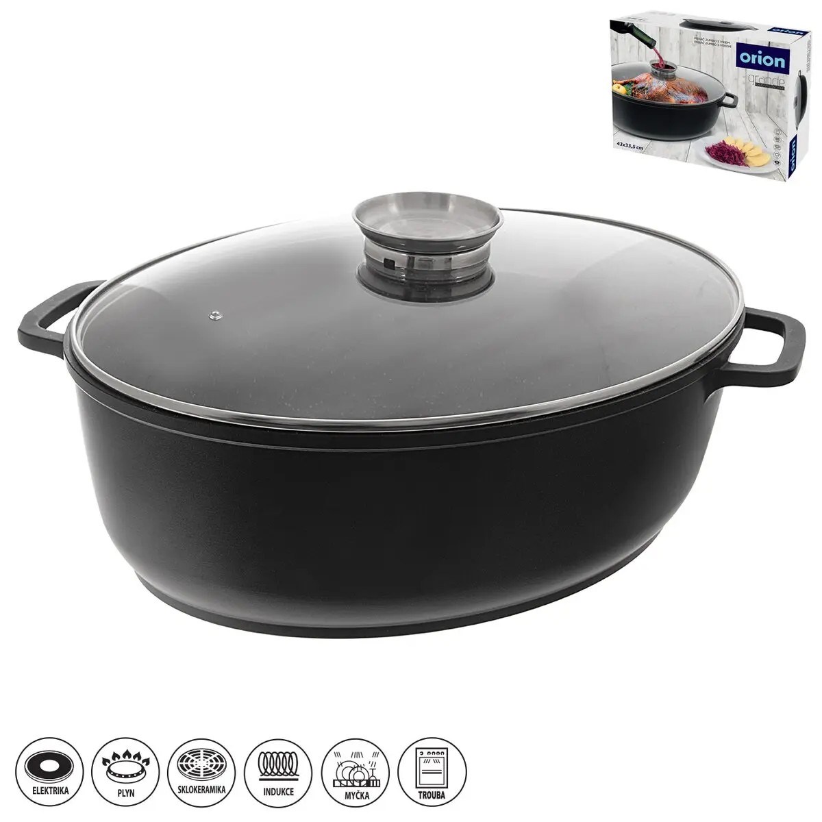 Pekáč GRANDE JUMBO využijete jako klasický pekáč na přípravu masa pro celou rodinu nebo jako aroma pekáč s poklicí. Díky své velikosti se skvěle hodí na vaření nebo pečení většího množství jídla. Je skvělý na husu nebo krůtu, na vepřovou pečeni, pohodlně v něm uvaříte velké šišky knedlíků, využít jej můžete při vaření všech surovin společně v jednom hrnci (kuře s brambory a nádivkou)... Skleněná poklice s otvorem pro únik páry a s aroma úchytem umožní jemné dávkování tekutých dochucovadel-olejů, vína… bez nutnosti odklopení poklice. Dochucovadlo nalijete do úchytu a ono samovolně protéká skrz otvor dovnitř do pekáče. Pekáč je opatřen uvnitř velmi kvalitním nepřilnavým povrchem PFLUON GRANIT ve 2 vrstvách, který Vám umožní přípravu jídel na minimálním množství tuku. Vně je jedna vrstva kvalitního nepřilnavého povrchu PTFE. Díky úpravě vnějšího povrchu můžete pekáč použít na všechny typy tepelných zdrojů včetně indukce a do trouby (skleněná poklice max. 200 °C, pekáč max. 230 °C). Výhodou jsou mimostředně umístěné úchyty, díky kterým se pekáč pohodlně vejde do trouby. Materiál: slitina hliníku s velmi kvalitním nepřilnavým povrchem, skleněná poklice s nerezovou aroma nálevkou. Výhodou je jeho lehkost a snadná manipulace. Rozměry: vnitřní 42x32x13 cm, vnější 43x33,5x14 cm, celková výška s poklicí 20 cm. Při manipulaci doporučujeme použití kuchyňských chňapek. Vhodný do ledničky, do myčky na nádobí – vlivem agresivních čisticích prostředků může dojít k nepatrné oxidaci dna – tento jev nemá vliv na proces vaření, není zdravotně závadný a nemůže být předmětem reklamace. Náhradní poklice z naší nabídky 711439. Součástí balení je několik receptů.