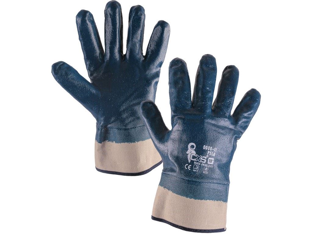 Povrstvené rukavice PELA, modré, vel. 10Rukavice máčené v nitrilu s pevnou manžetou. Doporučené použití: olejnaté prostředí, práce s PHM. Odvětví: strojírenství, zemědělství, čerpací stanice.