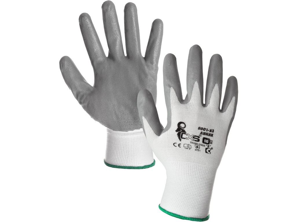 Povrstvené rukavice ABRAK, bílo-šedéRukavice s dlaněmi a prsty povrstvenými nitrilovou pěnou. Doporučené použití: práce ve vlhkém nebo lehce zaolejovaném prostředí. Odvětví: stavebnictví, lehký průmysl.