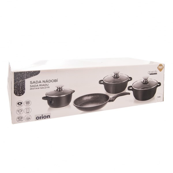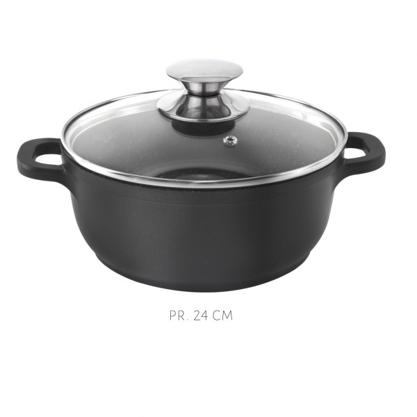 Všestranná sada 3 hrnců s objemem 1,4, 2,4 a 4,2 l a praktické pánve s antiadhezním povrchem průměru 24 cm, díky které objevíte nový rozměr při vaření, restování, smažení i zapékání. Hliníkový korpus je potažen kvalitní nepřilnavou vrstvou PFLUON GRANIT, která umožňuje vaření s minimem tuku. Omáčky, krémy i zredukované šťávy snadno stáhnete třeba stěrkou.Hrnce jsou opatřeny skleněnou poklicí s nerezovým lemem a otvorem pro únik přebytečné páry, budete tak mít přehled nad stavem připravovaného pokrmu. Tato velikost se hodí pro přípravu polévky, omáčky s vařeným hovězím a různých příloh, a pánev s příjemnou ergonomickou rukojetí na restování zeleniny, přípravu vajec nebo třeba šťavnatých steaků s karamelizovanou cibulkou.