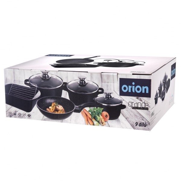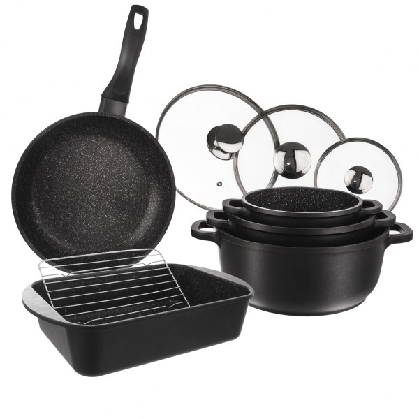 Všestranná sada 3 hrnců s objemem 1,4, 2,4 a 4,2 l, praktické pánve průměru 24 cm a pekáče 35x22x8 cm s antiadhezním povrchem a roštem, díky které objevíte nový rozměr při vaření, restování, smažení i zapékání. Hliníkový korpus je potažen kvalitní nepřilnavou vrstvou PFLUON GRANIT, která umožňuje vaření s minimem tuku. Omáčky, krémy i zredukované šťávy snadno stáhnete třeba stěrkou.Hrnce jsou opatřeny skleněnou poklicí s nerezovým lemem a otvorem pro únik přebytečné páry, budete tak mít přehled nad stavem připravovaného pokrmu. Tato velikost se hodí pro přípravu silného vývaru, omáček a dalších oblíbených pokrmů, pánev s příjemnou ergonomickou rukojetí na restování zeleniny nebo třeba šťavnatých steaků s karamelizovanou cibulkou a pekáč k pečení svíčkové, vepřového i zapečených jídel.