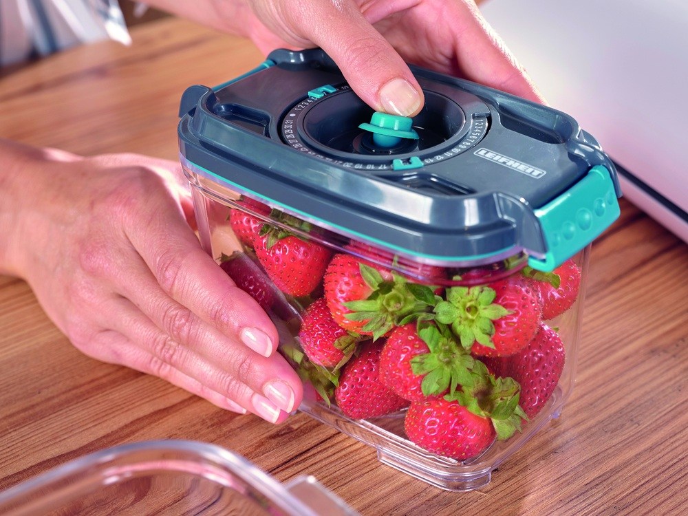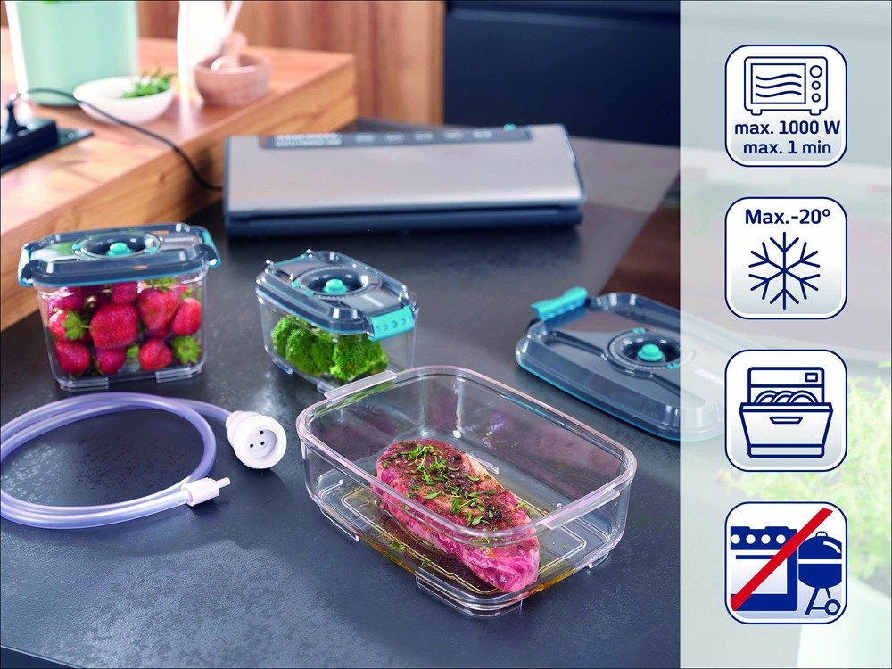Set dóz o objemu 500 ml, 800 ml + 1,4 l + vakuová hadice s adaptérem vhodné pro všechny vakuovačky Leifheit.- Prodloužená trvanlivost potravin díky optimálnímu vakuování