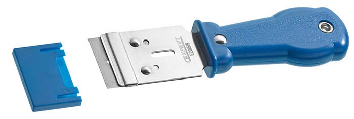 Škrabka s plastovou rukojetí a kovovým držákem pro uložení výměnné čepele