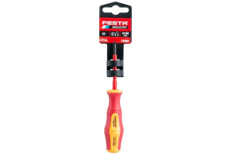Šroubovák FESTA má certifikaci elektro VDE 1000 V, IEC/EN 60900-2004, kovový dřík je vyroben z velmi kvalitní chromvanadiové oceli, kalený hrot je magnetický, kombinace polypropylenu a pryže na ergonomicky tvarované rukojeti zaručuje výborné antiskluzové vlastnosti a dobrou odolnost vůči mazadlům a chemikáliímZákladní parametry