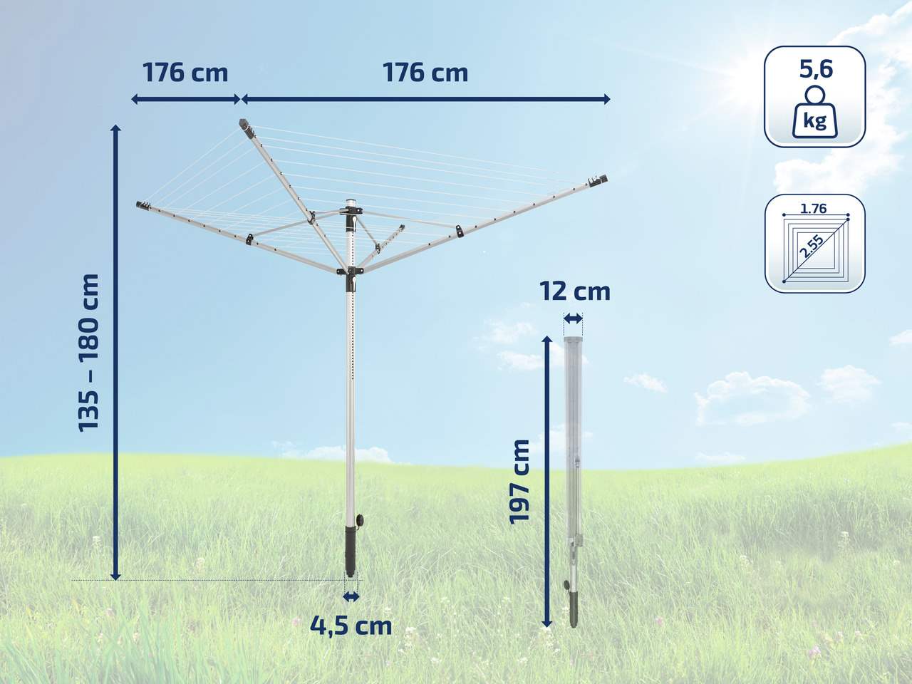• rozměr 1,76m, diagonála 2,55m