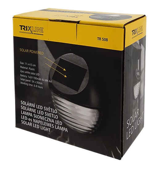Dekorativní LED solární světlo TRIXLINE TR 508Solární LED světlo vhodné k umístění na stěnu nebo podél schodiště. Rozsvítí příjezdové cesty bílým studeným světlem. Spolu se zabudovaným solárním panelem je toto senzorové osvětlení ideální pro bezpečnostní účely. Solární světlo je plně automatické, bezdrátové a spolehlivé. Osvětlení je nutné umístit na místo, odkud může solární panel zachycovat dostatek slunečního svitu pro správné nabití baterie.