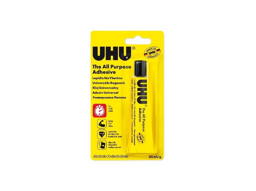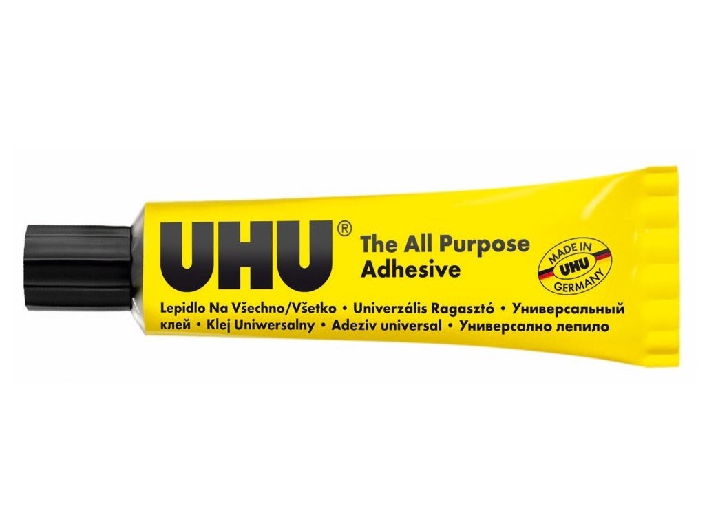 Univerzální lepidlo UHU lepí téměř vše. Není vhodné pro polystyren, PP a PE.