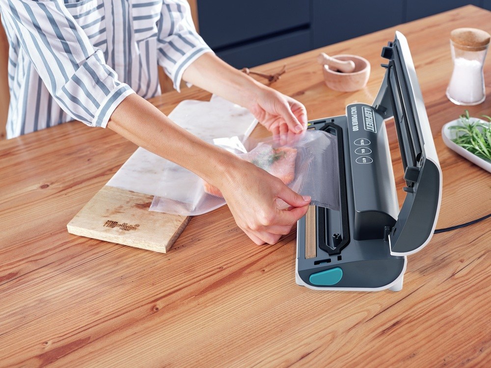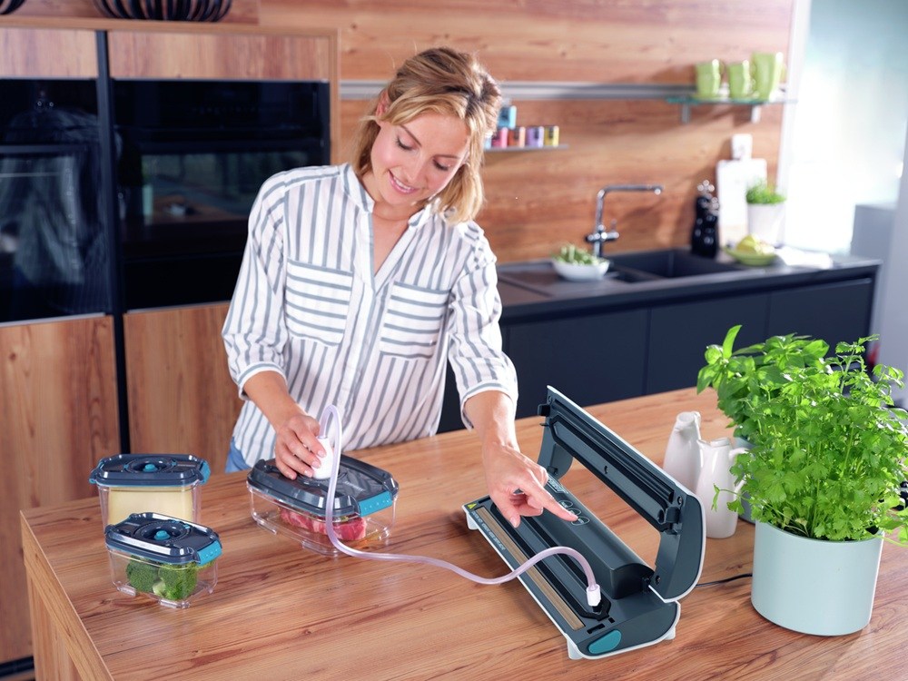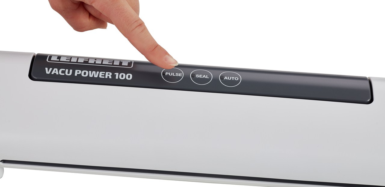 Vakuovačka Vacu Power 100 značky Leifheit s příkonem 80 W a sacím výkonem 4l/min.Vakuování je plně automatické.