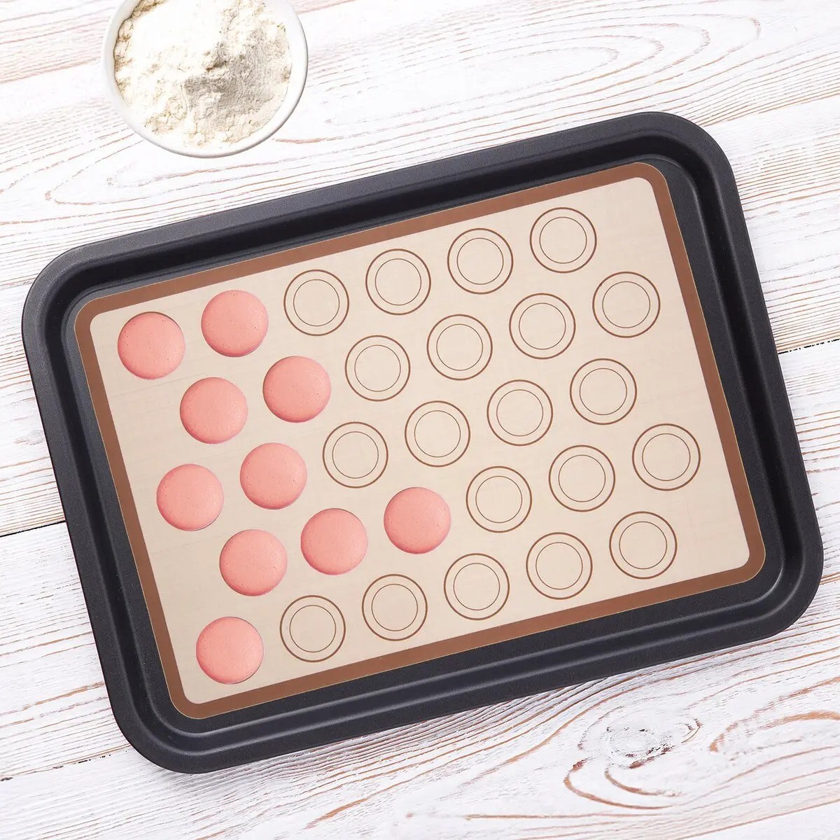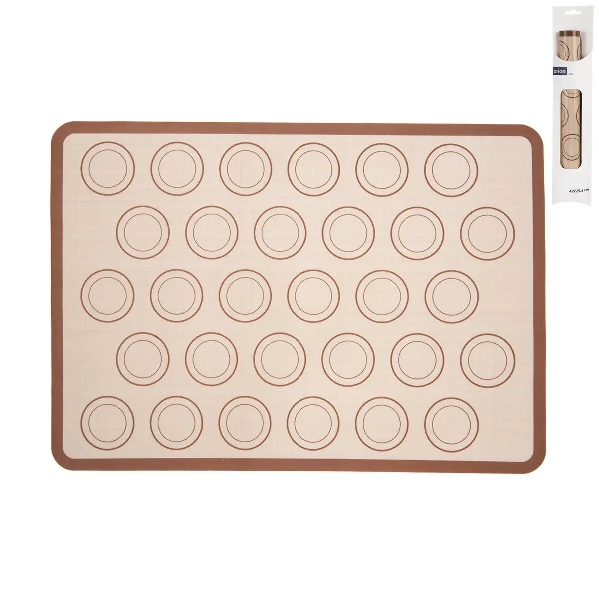 Silikonový vál s vyznačenými kruhy 2 velikostí umožní snadno vytvořit rovnoměrné tvary a velikosti. Je to skvělý pomocník při pečení makronek, věnečků a jiných kulatých dezertů. Silikonový vál vyztužený skleněným vláknem využijete také pro vyvalování a tvarování těsta. Vál dokonale přilne ke stolu, těsto se na vál nelepí. Je skladný, lze i srolovat. Těsto nikdy nekrájejte kovovým nožem, pouze vykrajovacím rádélkem nebo tvarovací formičkou s neostrými hranami. Doporučujeme Vám silikonové nože. 30 vyznačených kruhů. Materiál: 70 % silikon odolný vůči teplotám -40 °C až +200 °C (při teplotě od 190 °C v troubě max. 2 hodiny), 30 % skleněné vlákno. Rozměry: 42x29,5x0,07 cm, pr. vyznačených kruhů 3,2 cm a 4,5 cm. Vhodný do myčky na nádobí, do trouby, do MVT i mrazničky.