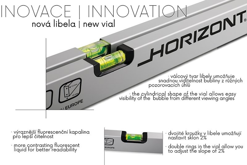 • inovovaná horizontální válcová libela - snadná viditelnost ze všech úhlů pohledu• dvojité kroužky v libele - vnější kroužky pro sklon 2%