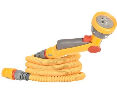 Nová lehká, pružná hadice s měkkým, tkaným vnějším pláštěm. Po poklesu tlaku vody v hadici se mírně roztáhne na trojnásobek své vlastní délky. Oba konce hadice jsou sériově vybaveny přípojkou na hadici s vodním zastavením, která udržuje stálý tlak v hadici a brání nežádoucímu smršťování hadice během používání. Díky velmi elastické vnitřní vrstvě z přírodního kaučuku nemůže hadice prasknout. Po použití jednoduše odšroubujte hadici na straně kohoutku. Zbytek vody v hadici lze snadno vyprázdnit na požadovaném místě na zahradě. Hadice má délku 12,5 m a je ideální pro malé zahrady, terasy nebo balkóny. Dodává se s příslušenstvím, univerzální armaturou a nastavitelnou zahradní stříkačkou.Parametry