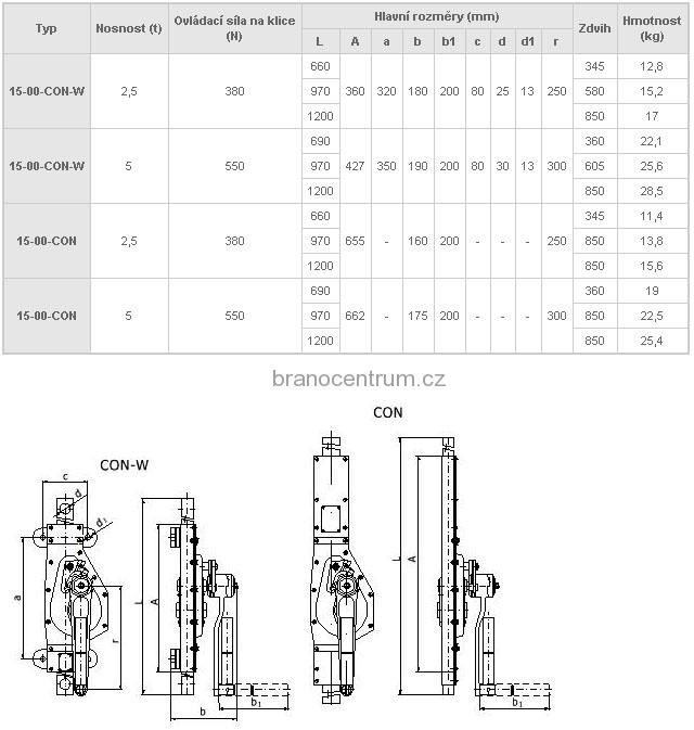 – pro zvedání vík a střech kontejnerů, manipulace se stavidly vodních nádrží, zvedání česel nebo hradidel v čističkách odpadních vod, napínací stanice lanovek - mnoho dalších aplikací pro ruční zvedání a spouštění - možnost používání také v prostředí s nebezpečím výbuchu (označení NEXP) Vlastnosti: - robustní, jednoduchá a „nezničitelná“ konstrukce - základní provedení (označení „CON“) umožňuje flexibilní přizpůsobení zvedáku pro zabudování do konstrukce - v provedení „nástěnný“ (označení „CON-W“) připraven k montáži pomocí zabudovaných úchytů a otvorů na koncích hřebenové tyče - spolehlivě udrží břemeno v libovolné poloze brzdou zabudovanou v ruční klice - přijatelná ovládací síla na ruční klice